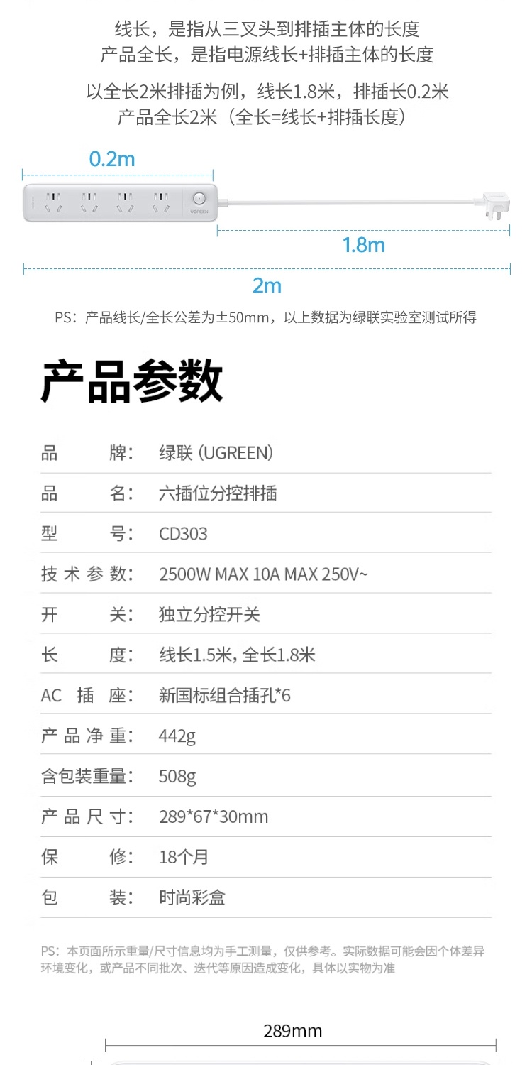 商品名称:绿联 90505 新国标6位分控防雷插座 抗电涌防电涌插线板/排插/接线板/拖线板 线长1.5米 全长1.8米